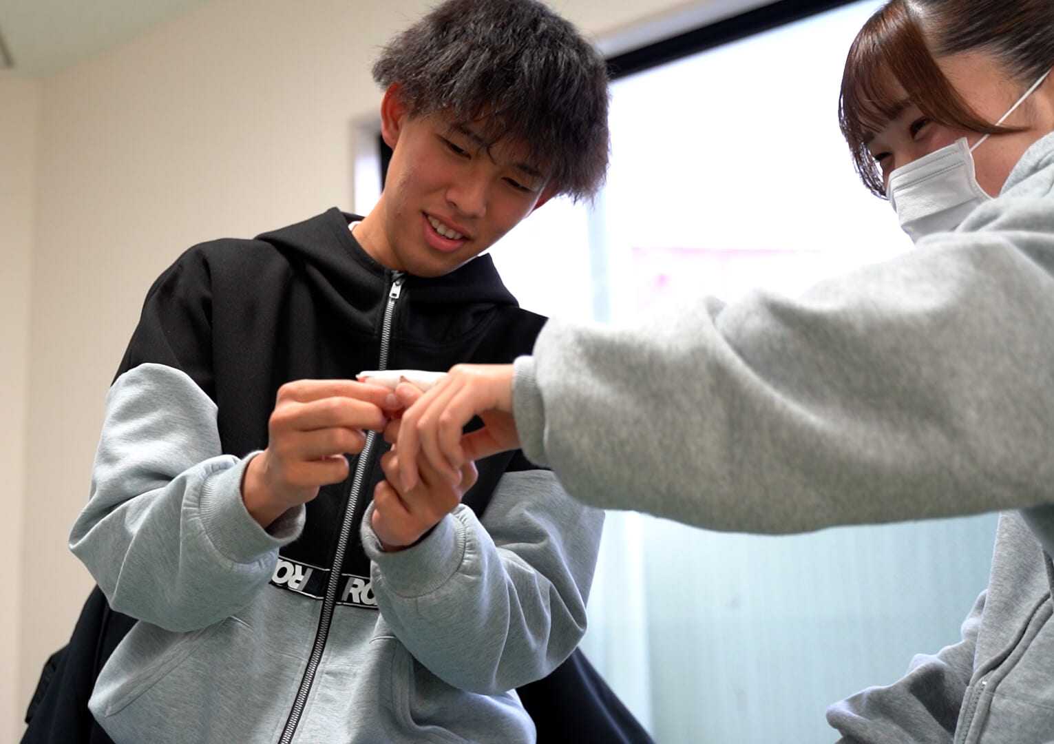 テーピング・マッサージ・リハビリ法などを学習。活躍の場はスポーツの現場だけでなく介護施設等にも広がっています。