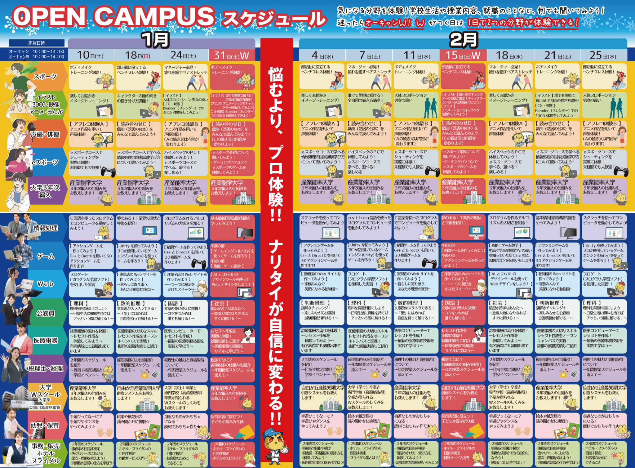 2026/01/20 ✨1月24日(土)オープンキャンパスのご案内 🔥 🎨 夢中になれる体験実習が盛りだくさん! どんな体験ができるか、パンフレットでチェックしてみてね! ▶ 分野別メニューを見る(PDF) 💯 交通費サポート/無料駐車場あり/ランチはケンタッキー🍗 🎁 さらに!何が当たるかお楽しみ♪ラッキーくじも開催中🎉 オープンキャンパスのお申込みはこちら